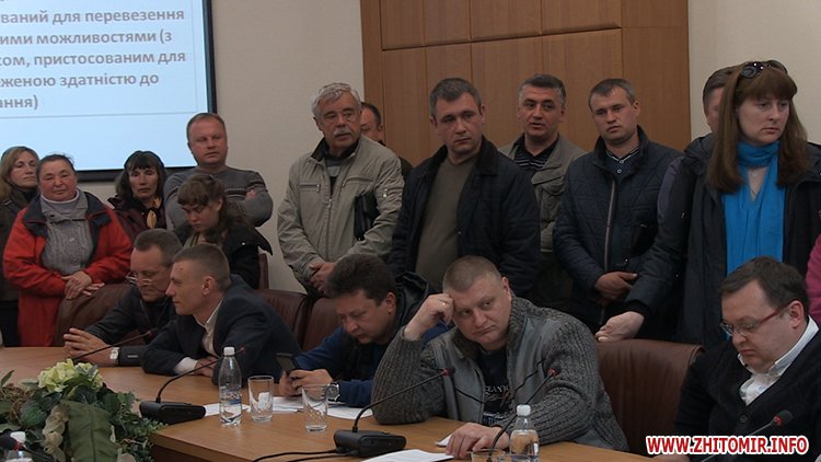 Заступник Житомирського міського голови Дмитро Ткачук зачитує 4 вимоги до перевізників: після підвищення ціни вони будуть змушені замінити 23 автобуси, яким більше 10 років, створити умови для перевезення для громадян із обмеженими можливостями, за порушення умов договору будуть змушені сплачувати штраф у розмірі 50 неоподаткованих мінімумів, та впровадити електронний квиток.