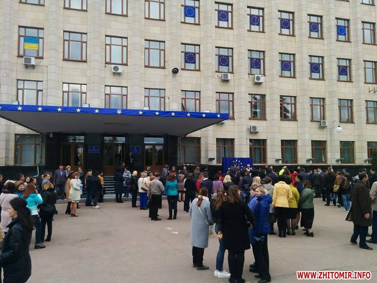 Перед будівлею облдержадміністрації зібралося близько 200 людей, переважно – працівники ОДА з маленькими прапорцями ЄС. За словами губернатора Ігоря Гундича, держслужбовці в робочий час прийшли на захід за покликом душі, бо підтримують європейські цінності.