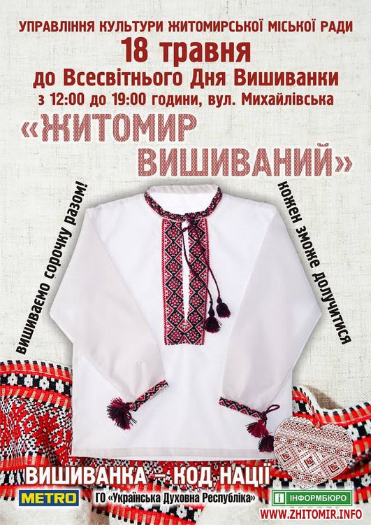 До всеукраїнського святкування Дня вишиванки 18 травня з 12:00 на вулиці Михайлівській розпочнеться великий захід – «Житомир вишиваний».