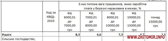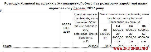 Про це йдеться в таблиці про розподіл кількості працівників Житомирської області за розмірами заробітної плати, яку 18 травня опублікувало головне управління статистики в Житомирській області.