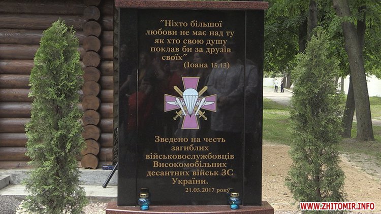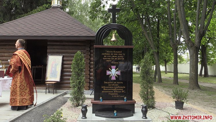 Також біля каплички встановили пам’ятник на честь загиблих військовослужбовців Високомобільних десантних військ Збройних Сил України. Відкрити його запросили родину загиблого кіборга Дмитра Ільницького. Наостанок представники духовенства на чолі із єпископом Житомирським і Овруцьким Паїсієм молитовно освятили будову та пам’ятну дошку біля неї.