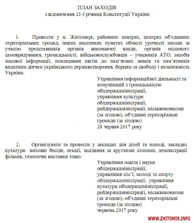 «Відповідно до ст.ст. 6, 39, 41 Закону України «Про місцеві державні адміністрації» та Указу Президента України від 20.04.2017 № 111 «Про відзначення 21-ї річниці Конституції України», з метою гідного відзначення у 2017 році 21-ї річниці Конституції України, враховуючи провідну роль Основного Закону України для розвитку правової системи держави затвердити план заходів з відзначення 21-ї річниці Конституції України (додається). Виконавцям плану заходів з відзначення 21-ї річниці Конституції України про стан його виконання інформувати управління культури облдержадміністрації до 30 червня 2017 року для узагальнення та інформування облдержадміністрації до 6 липня 2017 року», - зазначається у розпорядженні.