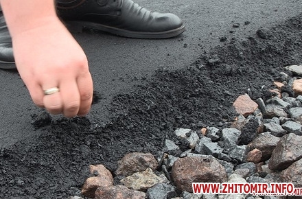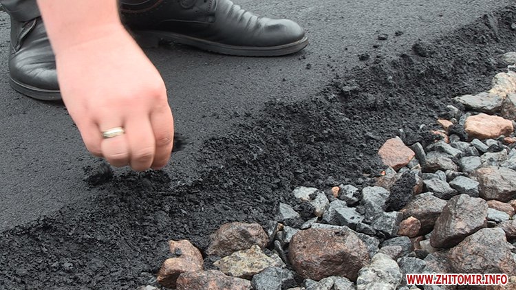 Асфальт, який кришиться в руках, поклали у місті Чуднів Житомирської області. Нове покриття на міцність перевірив член виконавчого комітету Житомирської міської ради Руслан Годований.