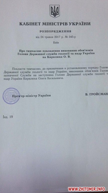 На фейсбук-сторінці Державної служби геології та надр України 25 травня опублікували нове розпорядження Кабміну про призначення Олега Кирилюка т.в.о. голови Держгеонадра.