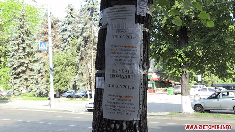 «Ми завідомо інформували, коли встановлювали нові зупинки. Показували на схемі, як то має бути розташовано. І перед прийняттям рішення на зупинках, де має зараз зупинятись громадський транспорт, були встановлені таблички, які інформували, з якого числа вони почнуть діяти. Тобто, з першого червня. І на зупинках існуючих були оголошення про те, куди саме переносяться зупинки. Водії тролейбусів озвучували про те, що зупинка з першого числа переноситься. На сьогоднішній момент по вулиці Покровській була зупинка навпроти магазину «Радіодеталі», де зупинялись і маршрутки, і тролейбуси. Зараз там зупинятимуться лише маршрутки. Тролейбуси відповідно ті, що повертатимуть направо по вулиці Київській, зупинятимуться біля магазину «Знання», а тролейбус №4, який повертає наліво, зупинятиметься біля «Укртелекому». По вулиці Київській: зупинка біля Михайлівського собору тепер має два своїх прояви - біля «Укртелекому», або за адресою Київська, 8. Біля «Укртелекому» зупинятимуться лише тролейбуси. Фактично це переміщення зупинки з Покровської. На Київській, 8 зупинятимуться і тролейбуси, і маршрутки», - розповів заступник Житомирського міського голови Дмитро Ткачук.