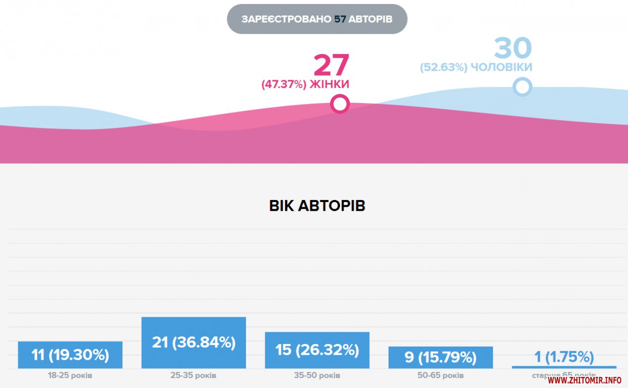 Більше половини авторів (52,63%) – чоловіки, вік більшості авторів – до 35 років, 38 з 99 проектів відносяться до категорії «Комфортне місто».