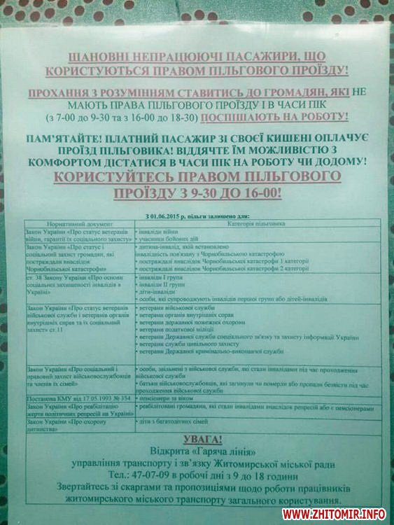 У коментарі під публікацією на Житомир.info «Перший день проїзду по 5 гривень в Житомирі…» користувач Facebook під ніком Val Ger повідомляє, що 2 червня в маршрутному таксі №8 водій наполягав на сплаті за проїзд пільговиків і розповідав, що «безкоштовно буде з 9:30». Нагадаємо, однією з умов підвищення тарифу на проїзд в маршрутках було безкоштовне перевезення цілого ряду пільговиків.