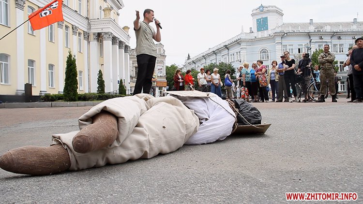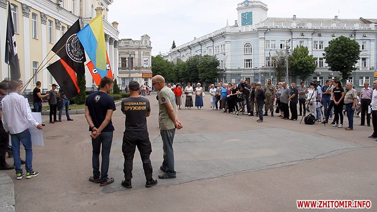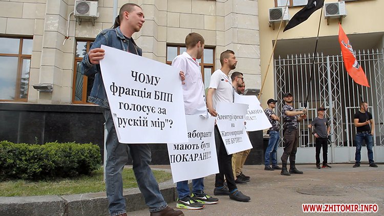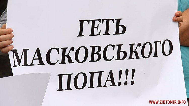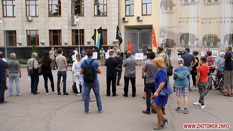 «Колаборанти мають бути покарані» - саме з таким гаслом 7 червня під стінами обласної ради відбулась акція протесту проти передачі земель монастирю УПЦ Московського патріархату у селищі Чоповичі Малинського району. На майдані Корольова зібралось кілька десятків людей, серед яких були і колишні військові-добровольці. Чоловіки кажуть: їх обурило те, що депутати з другої спроби проголосували за виділення землі церкві Московського патріархату.
