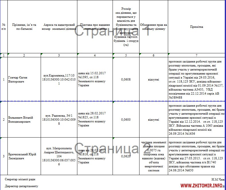 В додатку 1 – три прізвища поранених в АТО, яким передаються земельні ділянки в Житомирі.
