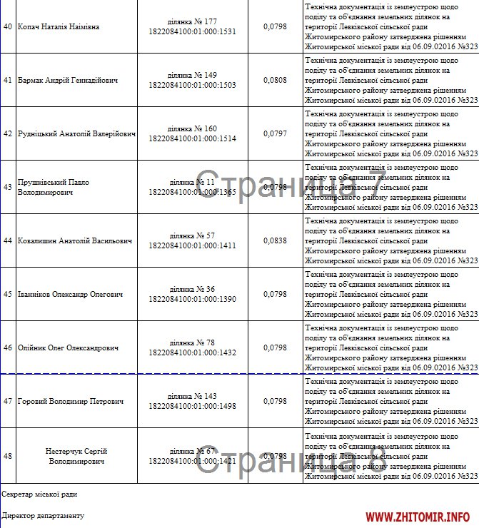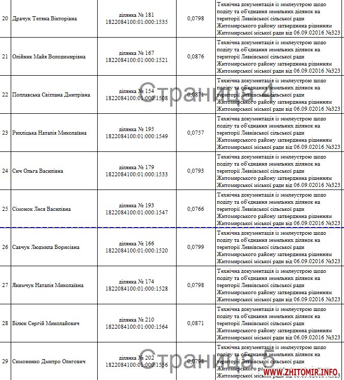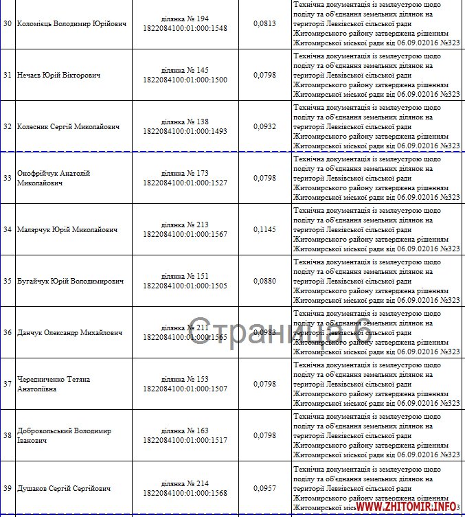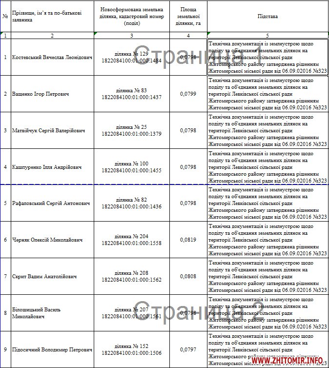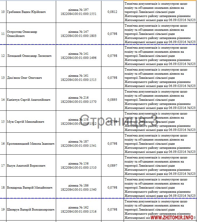 В додатку 2 – 48 прізвищ людей, які отримують по 0,0798 га «для індивідуального садівництва». Підставою для передачі ділянок зазначена технічна документація із землеустрою щодо поділу та об'єднання земельних ділянок на території Левківської сільської ради Житомирського району, затверджена рішенням Житомирської міської ради від 06.09.2016 №323.