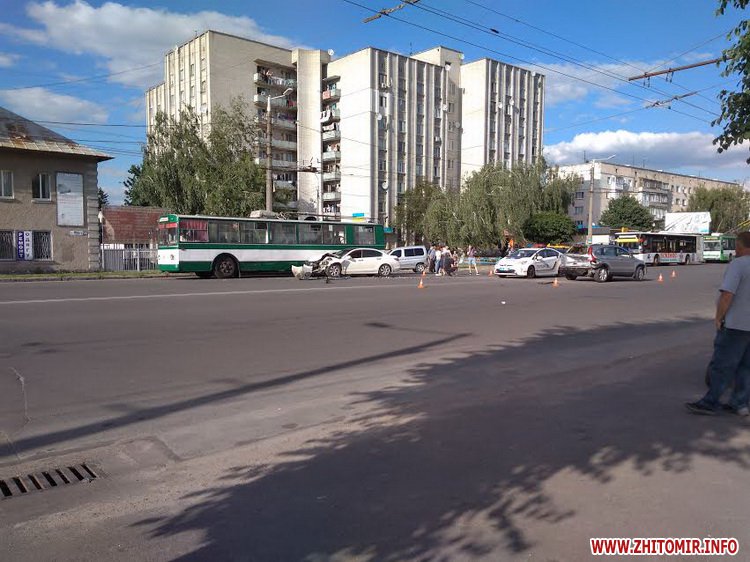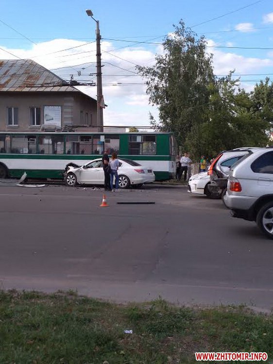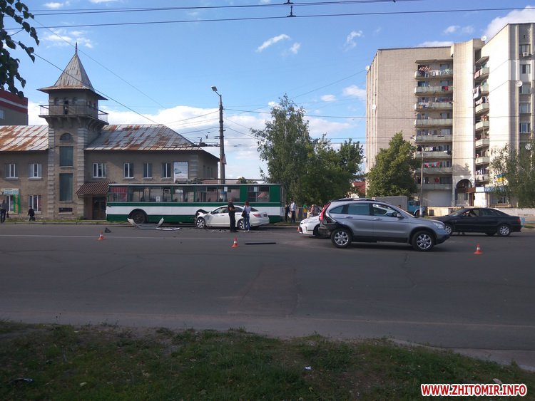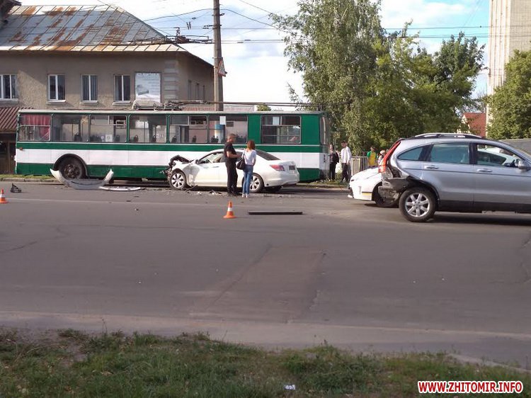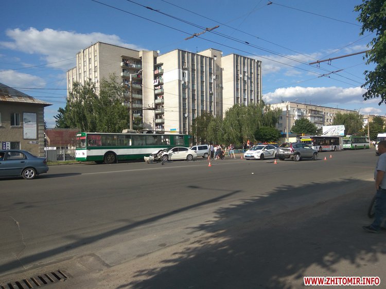 У Житомирі біля панчішної фабрики 10 червня близько 17:00 сталася дорожньо-транспортна пригода за участі тролейбуса та ще двох автомобілів.
