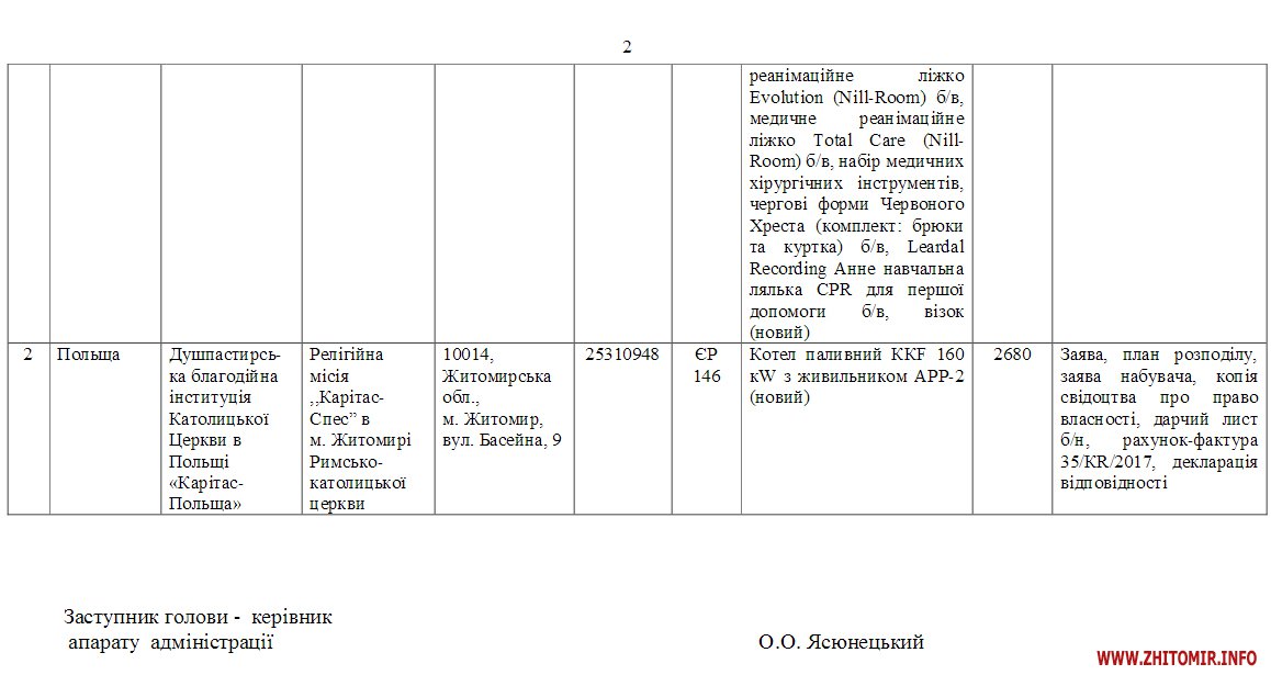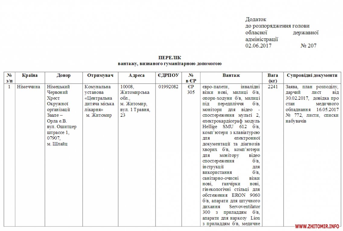 Житомирська облдержадміністрація визнала вантажі з-за кордону для комунальної установи «Центральна дитяча міська лікарня» та релігійної місії «Карітас-Спес» в м. Житомирі Римсько-католицької церкви гуманітарною допомогою.