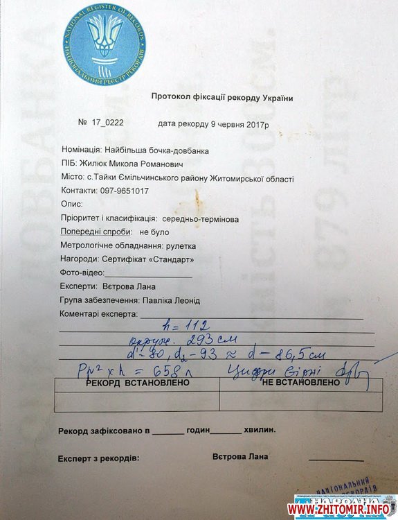 «Висота бочки – 112 см, діаметр – 86,5 см, окружність – 293 см, ємкість – 658 літрів. Остаточні параметри, встановлені у ході технічної частини, засвідчили право власника отримати відповідний документ», - йдеться у повідомленні.