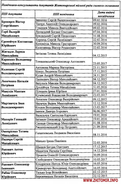 Станом на 14 червня 2017 року 56 людей мають посвідчення помічників-консультантів депутатів Житомирської міської ради. 18 помічників почали допомагати депутатам відразу після початку каденції, з листопада-грудня 2015 року, 7 осіб стали помічниками-консультантами лише цього року.