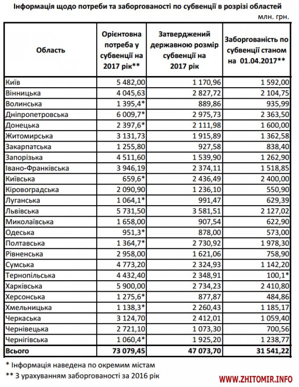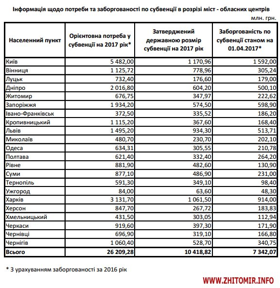 Так, орієнтовна потреба Житомирської області у субвенції на 2017 рік (з урахуванням заборгованості за 2016 рік) становить 3 млрд 131,73 млн грн, затверджений державою розмір субвенції на 2017 рік – 1 млрд 915,89 млн грн, заборгованість по субвенції станом на 1 квітня цього року – 1 млрд 362,58 млн грн. Потреба Житомира у субвенції на поточний рік – 676,75 млн грн, затверджений державою розмір субвенції – 347,97 млн грн, борг на 1 квітня – 222,62 млн грн.