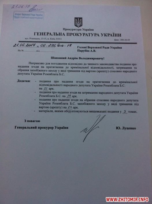 Генеральний прокурор Юрій Луценко 21 червня вніс подання до Верховної Ради на надання згоди на притягнення до кримінальної відповідальності, затримання та арешт народного депутата Борислава Розенблата, який входить до фракції Блоку Петра Порошенка та був обраний по мажоритарному округ №62 (м.Житомир).