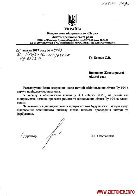 «Розглянувши ваше звернення щодо петиції «Про відновлення літака ТУ-104 в парку» повідомляємо наступне. У зв’язку з обмеженням коштів у КП «Парк» Житомирської міської ради на даний час підприємство не може провести ремонт та відновлення літака Ту-104 за власні кошти. За наявності відповідних коштів підприємством будуть вжиті заходи щодо відновлення зовнішнього вигляду літака шляхом проведення чистки та фарбування», - йдеться у відповіді від 20 червня 2017 року.
