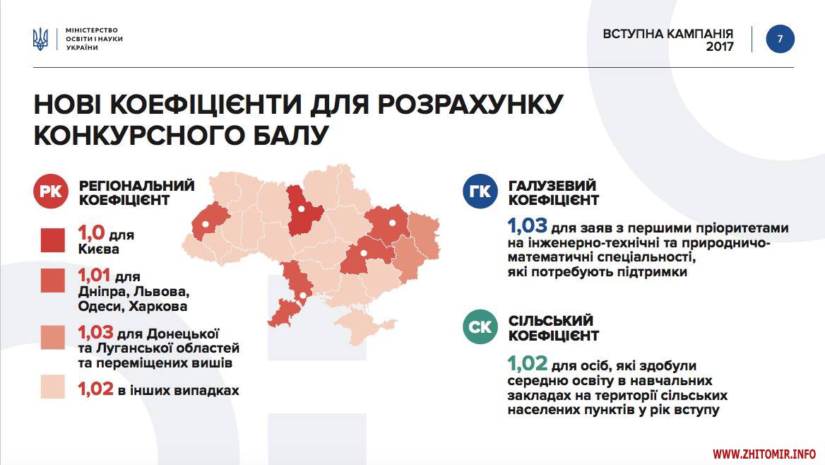 На цьогорічній вступній кампанії під час зарахування студентів будуть застосовуватися коефіцієнти, які множитимуть на здобутий результат ЗНО вступника, бал атестата й інші додаткові досягнення, залежно від регіонального та галузевого показників, а також належності до сільської місцевості – повідомляє «Українська правда» в матеріалі з прес-конференції міністра.