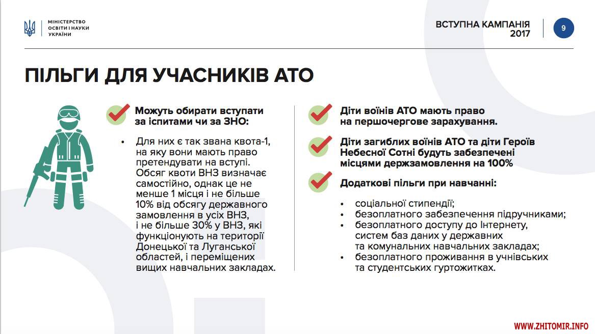 Для людей, які брали участь в АТО є «квота-1», на яку вони мають право при вступі. Вони матимуть право безкоштовного проживання у гуртожитках. У МОН також сприятимуть, щоб ветерани АТО, які мають бажання продовжувати освіту та склали вступні іспити, мали таку можливість на місцях, передбачених державним замовленням.