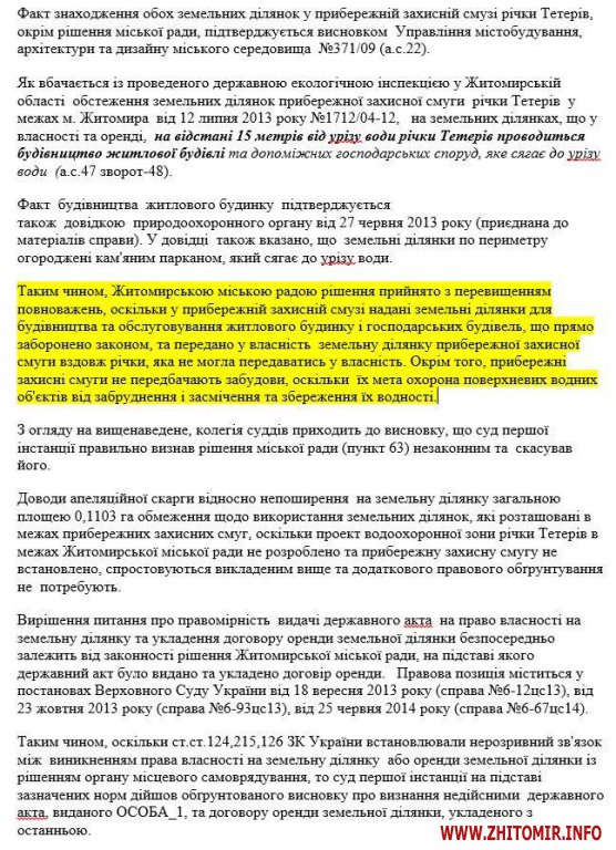 Як вбачається із матеріалів судових справ, «природоохоронний орган» проводив обстеження земельної ділянки і зафіксував, що «на відстані 15 метрів від урізу води річки Тетерів проводиться будівництво житлової будівлі та допоміжних господарських споруд, яке сягає до урізу води».