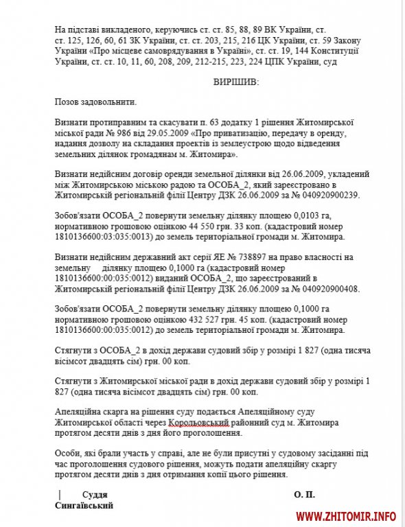 Справу прокуратура виграла і рішенням від 19 лютого 2014 року договір оренди землі між Євдощук О.В. і Житомирською міською радою та державний акт визнали недійсним. Власників зобов’язали повернути обидві земельні ділянки: 0,1 та 0,0103 га до земель територіальної громади м. Житомира.