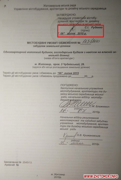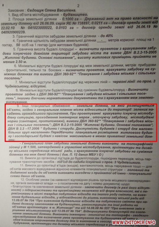 Головним архітектором Житомира на той момент був Сергій Руденко. Саме він у липні 2010 року підписав Олені Євдощук містобудівні умови і обмеження на будівництво. При тому, що у документі ж вказано, що генпланом це «територія зелених насаджень громадського призначення».