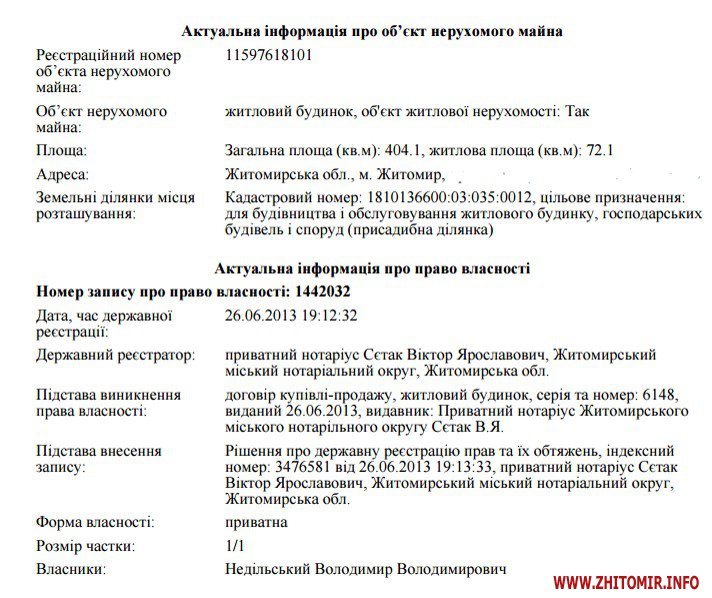 Будинок, який житомиряни бачать кожного разу, прогулюючись підвісним мостом у парку Гагаріна, за останній рік зібрав навколо себе чималу кількість публікацій, дописів у соцмережах та судових справ. Маєток огороджений високим парканом, перекриває доступ до річки, на березі – кількаметровий пірс та будиночки для птахів. Цю нерухомість звикли називати не інакше як «маєток Недільського», колишнього начальника житомирського УДАІ. Будинок дійсно зараз дійсно належить йому, але колишній керівник обласної Державтоінспекції придбав уже готову нерухомість.