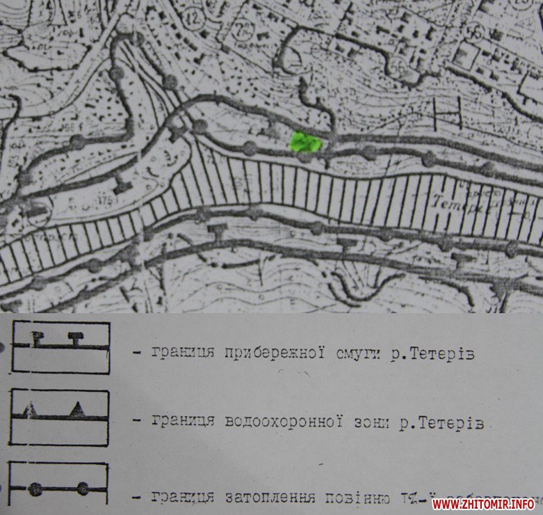 Крім того, ця ділянка знаходиться у прибережній смузі річки Тетерів. Відповідно до Водного кодексу України, мінімальна прибережна захисна смуга для «середніх річок» складає 50 метрів, а «у прибережних захисних смугах уздовж річок, навколо водойм та на островах забороняється будівництво будь-яких споруд (крім гідротехнічних, навігаційного призначення, гідрометричних та лінійних».