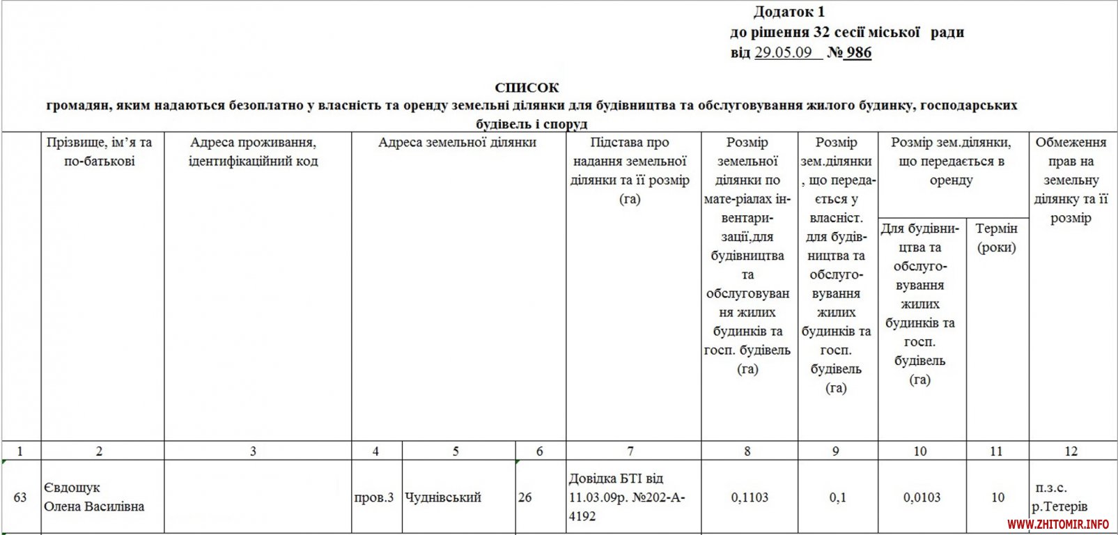 Згодом рішенням Житомирської міської ради від 29 травня 2009 року вона отримала на березі Тетерева у власність 0,1 га для будівництва житлового будинку і в оренду на 10 років ділянку площею 103 квадратних метри. Державний акт на право власності на земельну ділянку площею 0,1 га Євдощук Олена Василівна оформила 26 червня 2009 року.