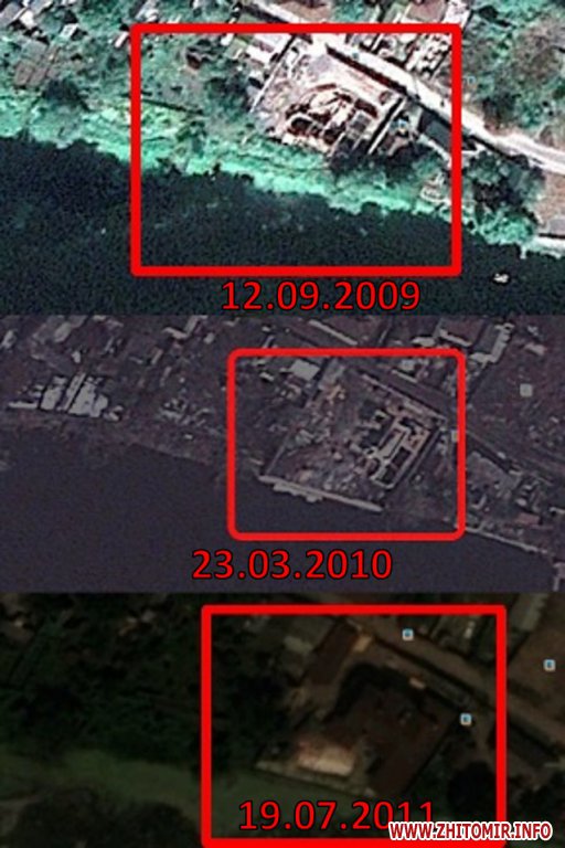 Процес захоплення берегової лінії та вирубки насаджень можна прослідкувати по супутниковим знімкам. Знімок від 12 вересня 2009 року – доступ до річки ще не перекритий, на місці будинку – будмайданчик. А вже на знімках від 21 березня 2010 видно, що дерева вирізали, а паркан перекрив доступ до річки. На супутникових знімках липня 2011 року вже є чітки обриси будинку.