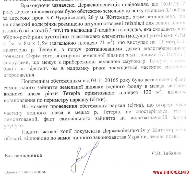 У відповіді на інформаційний запит Держекоінспекція повідомила, що обстежуючи цю ділянку 16 травня 2017 року, зафіксовано також Т-подібну надводну площадку (пірс), яка виступає в акваторію річки Тетерів, а також металеве огородження на березі. Сітку прибрали, а от паркан та пірс – ні.