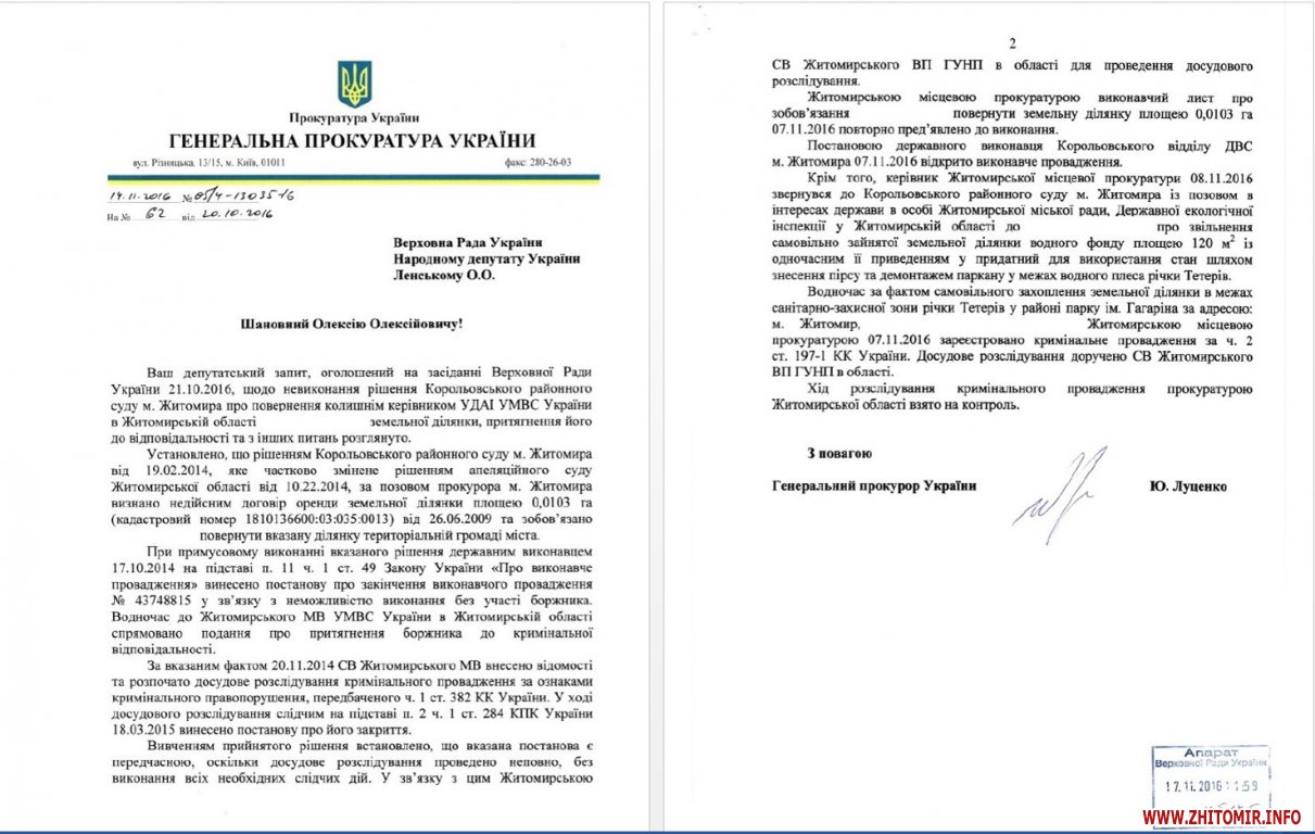 У липні 2013 року прокуратура Житомира позивалася до суду про визнання виділення землі міською радою протиправним та скасування державного акту на право власності земельних ділянок площами 0,1 га та 0,0103 га.