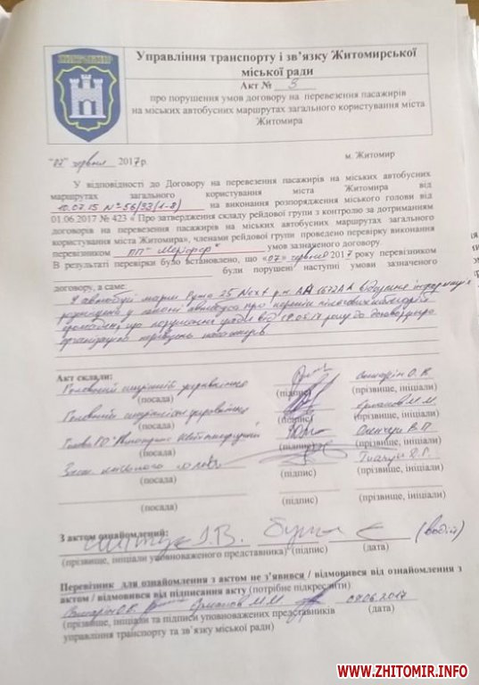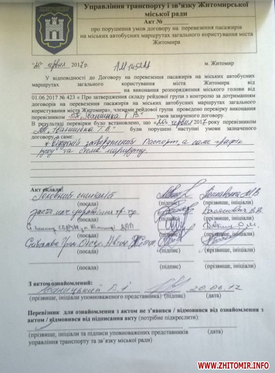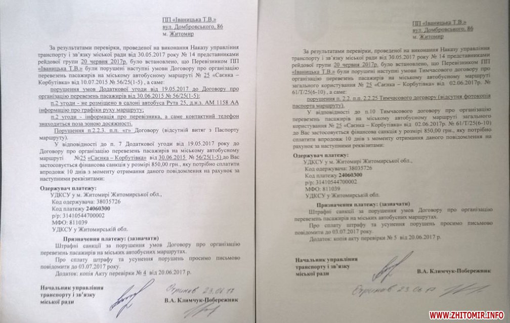 20 червня на перевізника Іваницьку Т.В. було складено два акти за відсутність графіку руху, схеми маршруту та інформації про перевізника. 26 червня Тетяна Іваницька сплатила 1700 грн штрафу.