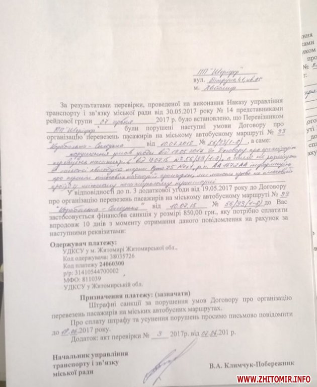 Житомирські перевізники вже сплачують штрафи за порушення договорів, що було передбачено додатковими угодами, підписаними у зв’язку з підвищенням вартості проїзду у маршрутках до 5 гривень.