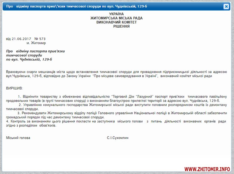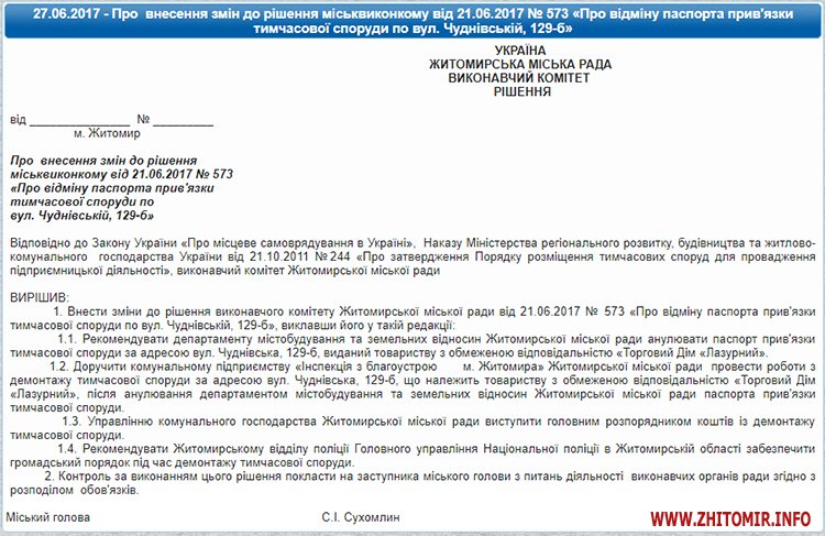 Як повідомляв Житомир.info, після засідання міськвиконкому 21 червня мер Житомира Сергій Сухомлин говорив, що у рішенні виконкому є пункт, по якому КП «Інспекція з благоустрою м.Житомира» має у найкоротший термін прибрати скандальний МАФ, але в опублікованому на сайті міськради рішення цього пункту немає.