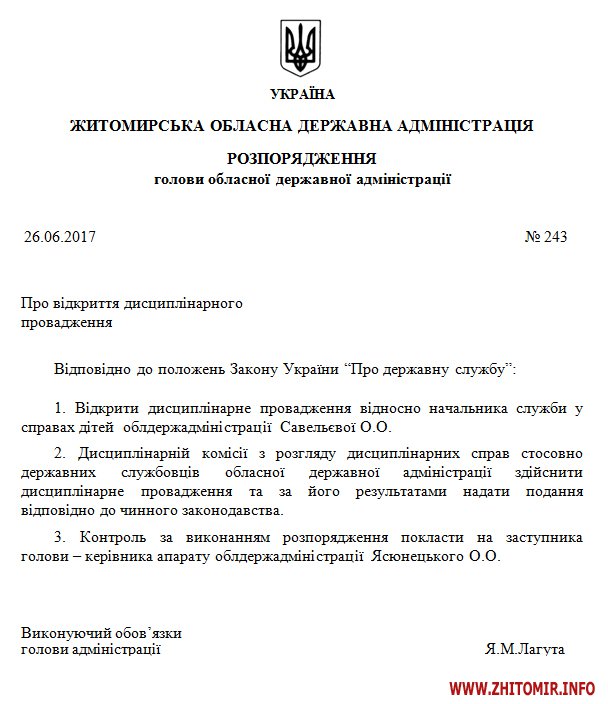 «Відкрити дисциплінарне провадження відносно начальника служби у справах дітей облдержадміністрації Савельєвої О.О. Дисциплінарній комісії з розгляду дисциплінарних справ стосовно державних службовців обласної державної адміністрації здійснити дисциплінарне провадження та за його результатами надати подання відповідно до чинного законодавства», - зазначається у документі, опублікованому на сайті ОДА.