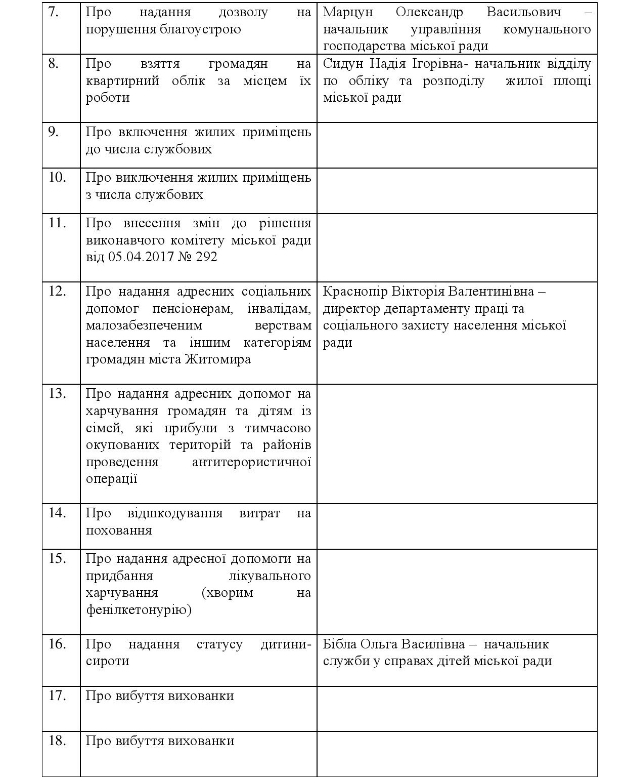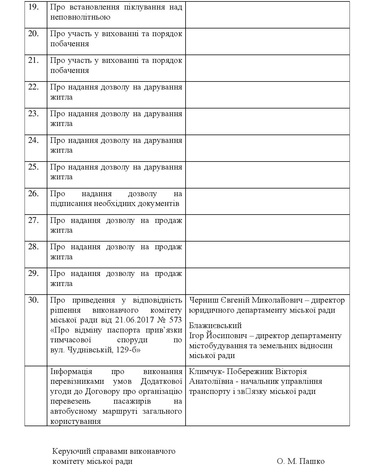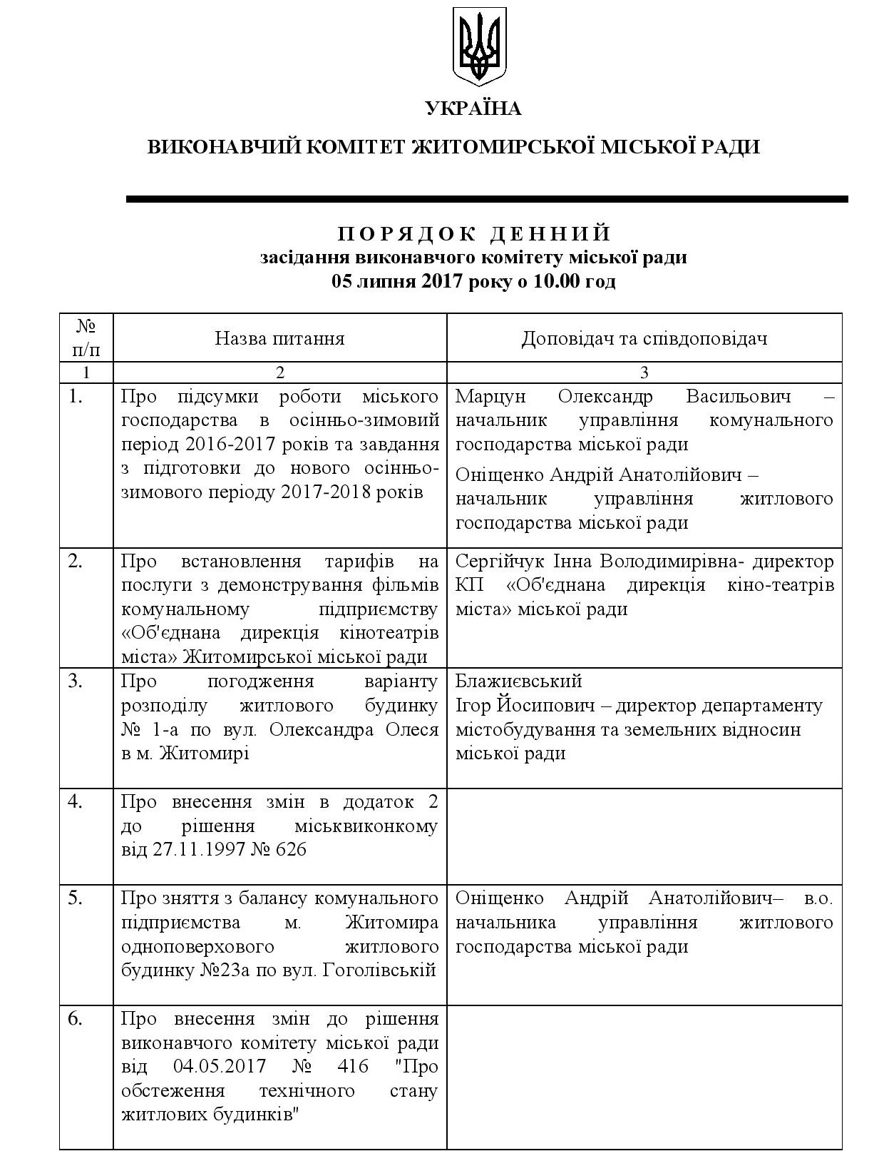 Зокрема члени виконкому планують привести у відповідність рішення щодо відміни паспорта прив’язки МАФу по вулиці Чуднівській, 129-б, обговорити завдання з підготовки до нового осінньо-зимового періоду, встановити тарифи на показ фільмів КП «Об’єднана дирекція кінотеатрів міста», надання допомоги на харчування дітей сім’ям переселенців, а також кілька десятків житлових і «дитячих» питань.
