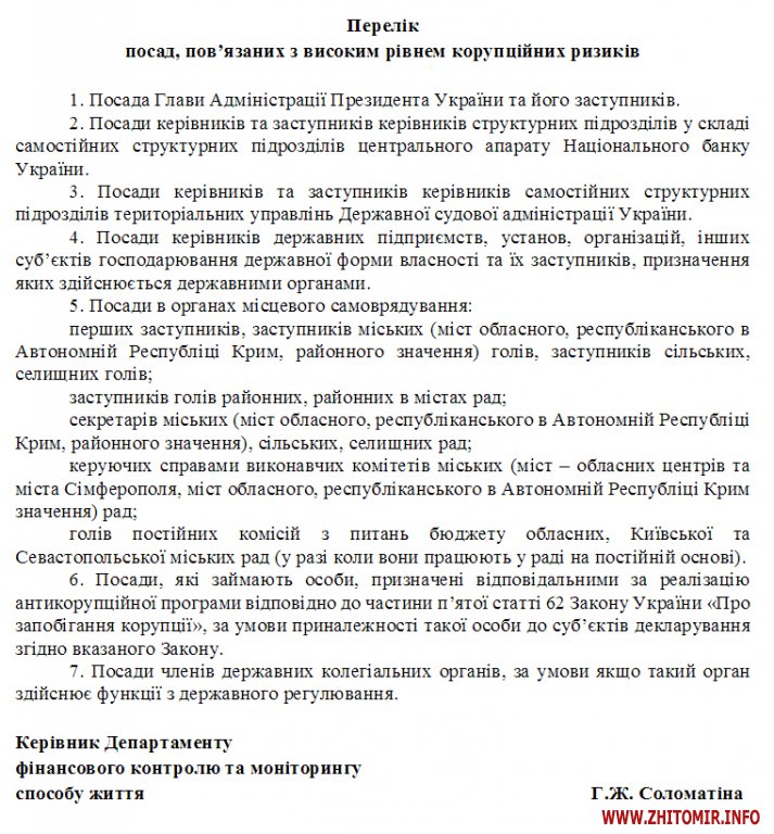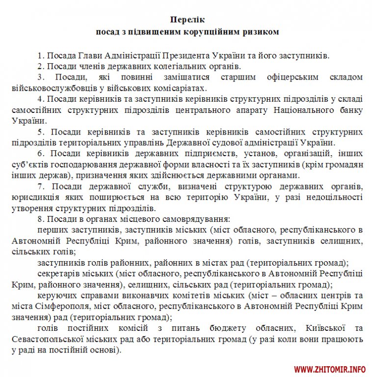 Посади в органах місцевого самоврядування з високим рівнем корупційних ризиків:перших заступників, заступників міських голів міст обласного та районного значення, заступників селищних, сільських голів; заступників голів районних, районних в містах рад; секретарів міських, селищних, сільських рад; керуючих справами виконавчих комітетів міських рад; голів постійних комісій з питань бюджету обласних, Київської та Севастопольської міських рад (у разі коли вони працюють у раді на постійній основі).