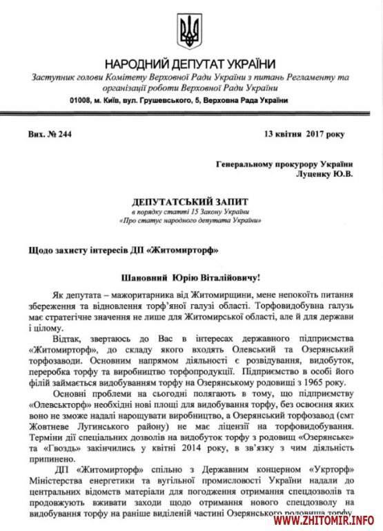 Народний депутат від Коростеньського округу Володимир Арешонков (фракція БПП) також звертався до генпрокурора Юрія Луценка щодо захисту інтересів Державного підприємства «Житомирторф».