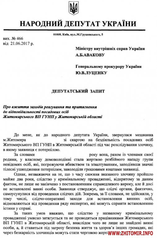 Народний депутат від Бердичівського округу Олександр Ревега скаржився Луценку на міністру МВС Авакову на посадових осіб Житомирського ВП ГУНП у Житомирській області та просив вжиття заходів реагування та притягнення їх до відповідальності. Запиту був озвучений на пленарному засіданні Верховної Ради 23 червня.