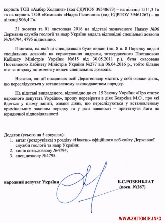 Нардепа від Житомира Борислав Розенблат (фракція БПП) крім звернення про незаконні дозволи ТОВ «Райт Солюшин» також в квітні «сигналізував» генпрокурору щодо неналежного виконання посадових обов’язків керівником Держгеонарда Бояркіним, який таємно видав спецдозволи на видобуток бурштину ТОВ «Амбер Холдинг» та ТОВ «Компанія «Надра Галичини».