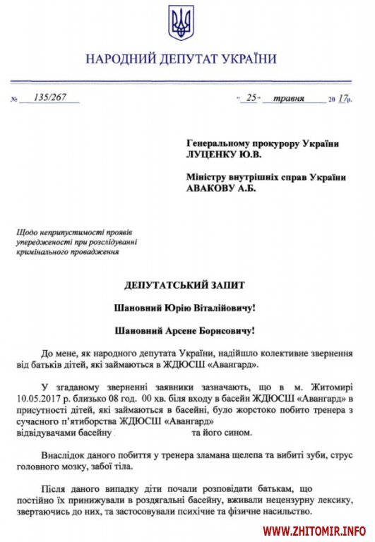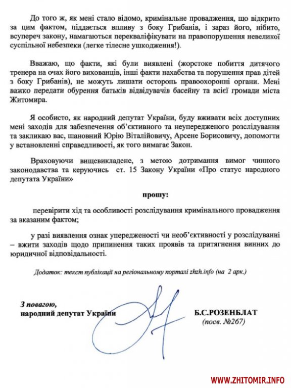 Крім того, наприкінці Розенблат звертався до генпрокурора та міністра МВД щодо розслідування інциденту з побиттям тренера в житомирському басейні «Авангард», який стався 10 травня цього року.