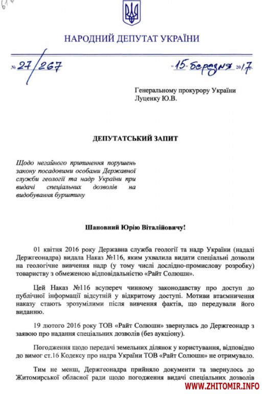 На сесії 17 березня був озвучений депутатський запит від вищеназваних нардепів та Вадима Кривенка (Народний фронт) щодо негайного припинення порушень закону посадовими особами Державної служби геології та надр України при видачі спеціальних дозволів на видобування бурштину. У запиті йшлося про скасування дозволу на видобуток бурштину ТОВ «Райт Солюшин».