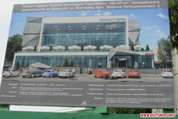 Декларація про початок будівельних робіт була видана 20 лютого цього року. Реконструкцію будівлі колишнього ресторану «Смоленськ» під об’єкт громадського призначення проводить ТОВ «Житомирпродторг». Підрядник – ТОВ «Компанія будівельників «Куб», зареєстрована в селі Зарічани Житомирського району.