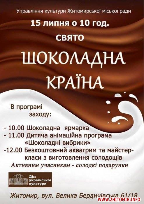 До всесвітнього Дня шоколаду 15 червня о 10:00 на подвір’ї Дому української культури відбудеться солодке свято «Шоколадна країна».