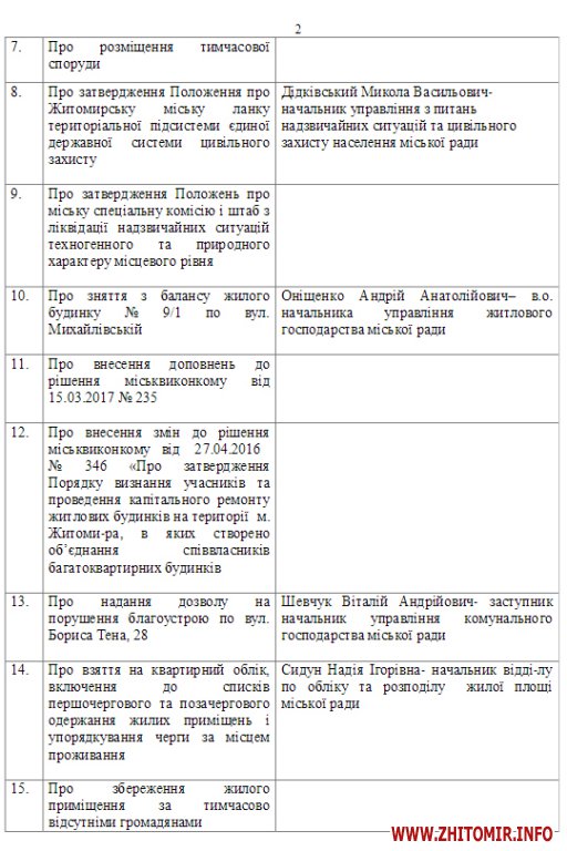 У порядку денному засідання 36 питань. Зокрема, члени виконкому будуть розглядати питання про відшкодування з інших бюджетів коштів за дітей, які навчаються у Житомирі, але живуть за межами обласного центру, впорядкування встановлення меморіальних дошок і пам’ятних знаків. Крім того, начальник управління транспорту та зв’язку поінформує членів міськвиконкому про виконання перевізниками умов додаткових угод до договорів.