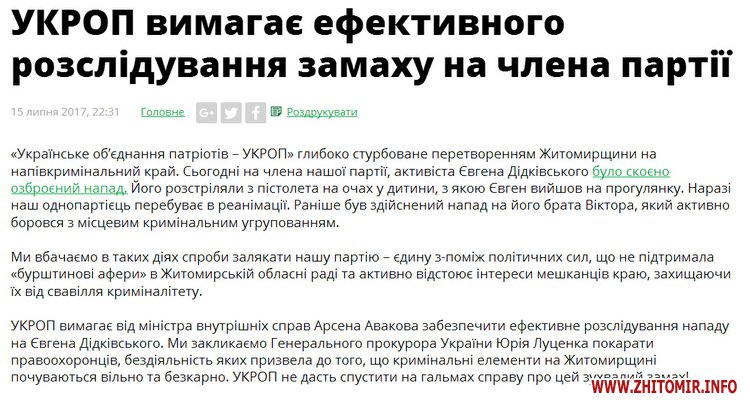 Як повідомляв Житомир.info, 15 липня в центрі Коростишева невідомі на мотоциклі стріляли у місцевого підприємця Євгенія Дідківського, чоловіка госпіталізувати до реанімації та прооперували.