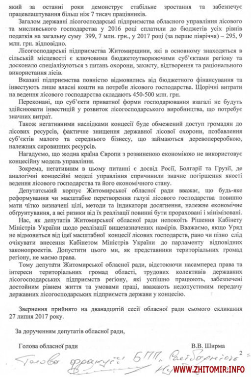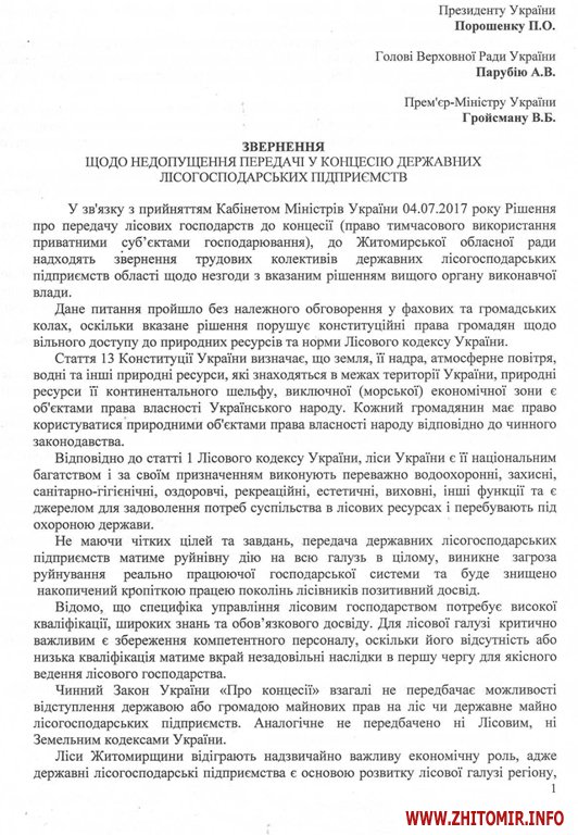 «Керуючись Законом України «Про місцеве самоврядування в Україні», враховуючи рекомендації постійної комісії обласної ради з питань агропромислового комплексу, земельних відносин та розвитку села від , обласна рада вирішила схвалити текст звернення депутатів обласної ради до Президента України, Голови Верховної Ради України, Прем’єр-міністра України щодо недопущення передачі у концесію державних лісогосподарських підприємств (додається). Доручити голові обласної ради підписати звернення», - зазначається у проекті.