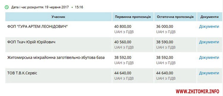 Тендер лікарня провела ще в червні, договір на постачання укладений 7 липня 2017 року. У тендері комунальної установи «Житомирська обласна дитяча клінічна лікарня» Житомирської обласної ради взяли участь два місцевих підприємства: Житомирська міжрайонна заготівельно-збутова база і ТОВ Т.В.К.Сервіс, житомирський ФОП Ткач Юрій Юрійович та ФОП Гура Артем Леонідович з міста Харків, який запропонував найнижчу ціну і визнаний переможцем торгів з пропозицією 36 000 грн за 480 кг масла без ПДВ (75 грн за 1 кг).