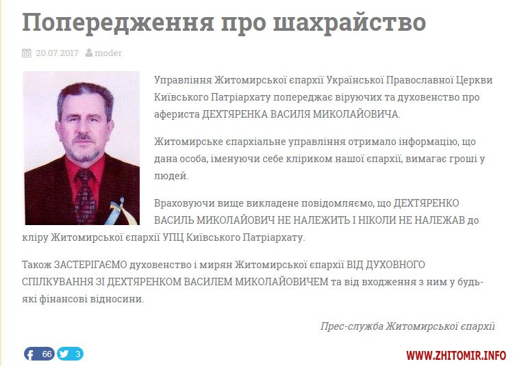 «Житомирське єпархіальне управління отримало інформацію, що дана особа, іменуючи себе кліриком нашої єпархії, вимагає гроші у людей. Враховуючи вище викладене повідомляємо, що ДЕХТЯРЕНКО ВАСИЛЬ МИКОЛАЙОВИЧ НЕ НАЛЕЖИТЬ І НІКОЛИ НЕ НАЛЕЖАВ до кліру Житомирської єпархії УПЦ Київського Патріархату. Також ЗАСТЕРІГАЄМО духовенство і мирян Житомирської єпархії ВІД ДУХОВНОГО СПІЛКУВАННЯ ЗІ ДЕХТЯРЕНКОМ ВАСИЛЕМ МИКОЛАЙОВИЧЕМ та від входження з ним у будь-які фінансові відносини», - йдеться в повідомленні за підписом прес-служби Житомирської єпархії.